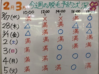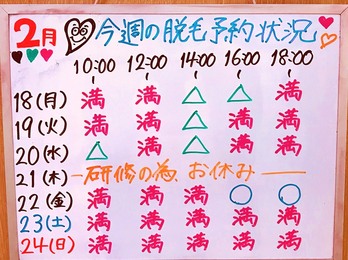 こんにちは(^^)今週の予約状況です。 ご確認お願い致します(^...