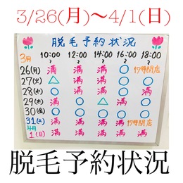 こんにちは=D来週3/26(月)~4/1(日)脱毛予約状況のお知...