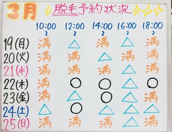 こんにちは☆3/19(月)~25(日)脱毛予約状況のお知らせです...